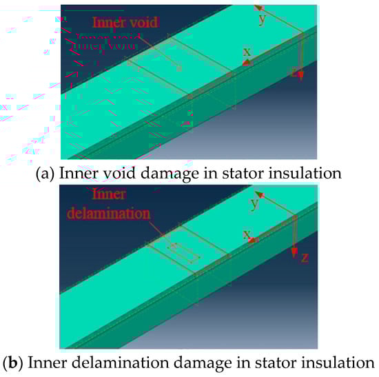 The FEM software ABAQUS is a powerful tool to simulate the propagation property of Lamb wave in structure. The three-dimensional FEM model of a stator bar was established with geometry of 1200 mm in length (x direction), 60 mm width (y direction) and 30 mm height (z direction). An inner void (shown in Figure 12a) of 2 mm diameter and 1 mm height (z direction) inside stator insulation was simulated and configured at (825, 30). Similarly, an inner delamination (shown in Figure 12b) of 5 mm (x direction), 10 mm (y direction) and 1mm height (z direction) inside the stator bar insulation was made at coordinate (825, 30).