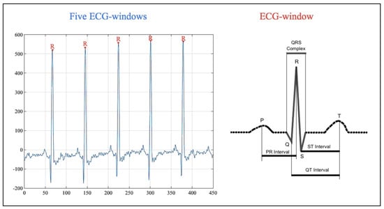 In our case, the experiments focus on heart signals. Particularly, the electrical signal of the heart can be measured by placing electrodes (e.g., three or 12 leads) on the body of the subject under analysis. The representation of this signal is the Electrocardiogram (ECG). There are five characteristics points in the ECG: (1) the P-wave represents the depolarization of the atria; (2–4) the QRS complex represents the depolarization of the ventricles; and (5) the T-wave represents the re-polarization of the ventricles [23]. In Figure 1, an ECG signal and its characteristics points are sketched.