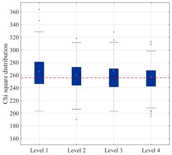 The bias of the outputted stream has been analyzed for each approach. To this end, the following experiment has been carried out. For each subject (199 in total), a file of 0.5 MB has been generated using the same procedure as described in Section 3 and analyzed using the ENT suite. In Figure 4, a box-plot of the chi-square values is shown. It is worth noting that the optimal value of the chi-square test was 256, and the greater the distance to this optimal value, the greater the bias in the data. Using this analysis, it could be concluded that the fourth level approach was the most appropriate to build a secure and robust TRNG based on ECG signals: the average value (blue circle) was the optimal one, and the distribution of values between the first and third quartile was the narrowest.