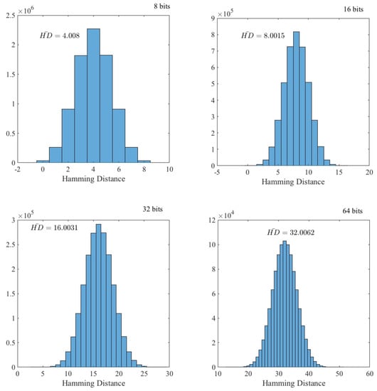 We have tested whether the random data generated from different ECG signals (each one belonging to a single individual) were distinct. If this holds, an adversary cannot use data from another individual to predict values generated by the target. To evaluate this, as in Section 4.1, a file of 0.5 MB has been generated for each individual (ECG record). Then, for each file, data were grouped into -bit words. In Figure 5, the data distribution of the Hamming distance between all the pairs ( in our particular case) of individuals belonging to the dataset is shown. As expected, the distribution fit a binomial distribution: