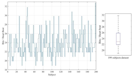 The particular number of bits that can be extracted from an ECG-window (including only one R-peak) depends on the heart rate of the individual. Figure 6 shows the average value of bits extracted per heart-beat for each of the 199 subjects belonging to the dataset. The overall average value of all these values is the value shown in Table 6.