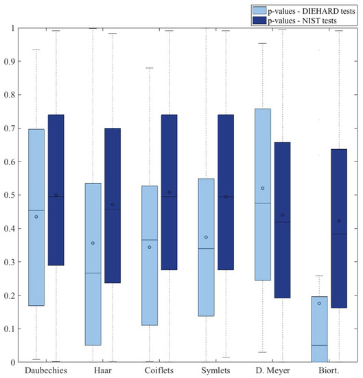 As already mentioned, Daubechies was our first approach since this is the common mother wavelet used for the analysis of the ECG signal [41,42,43]. Nevertheless, this paper explores how to extract randomness from ECG signals by multi-level wavelet decomposition, and to the best of our knowledge, this is the first time this approach has been studied. Therefore, the choice of the most appropriate wavelet family has not been evaluated before in the context of random number generation. Figure 7 summarizes the distribution of p-values for the tests included in the DIEHARD and NIST suites in order to gain a better overall perspective of the results. The biorthogonal approach can certainly be ruled out as the p-values were far away from an uniform distribution. In addition, Haar, coiflets and symlets are also not recommended as the median of the p-values fell well bellow the optimal value of 0.5. For all this, the use of Daubechies or discrete Meyer is recommended since with both approaches, the output stream behaved as a random variable.