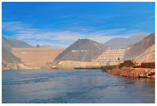 The Nuozhadu Hydropower Station is located at the lower reaches of the Lancang River at the junction of Cuiyun District and Jixian County, Simao City, Yunnan Province (the dam site is between the Kanjie River and the Burn Village Ditch) It is the fifth level of the eight cascade planning in the middle and lower reaches of the Lancang river. The project is a large (I) first-class project, and the permanent major hydraulic structure is a class 1 building. The project is mainly designed for electricity generation and also has comprehensive utilization benefits such as flood control, irrigation, aquaculture, and tourism. The reservoir has many years of regulating performance. The total storage capacity of the reservoir is 237.03 × 108 m3, and the installed capacity of the power station is 5850 MW (9 × 650 MW). The project consists of a core-wall rockfill dam, an open spillway on the left bank, a flood discharge tunnel on the left and right banks, an underground water diversion system on the left bank, a ground 500 kV switch station, and diversion projects. The core-wall rockfill dam is 627.87 m in length at the top, 18 m in width at the crest, 821.5 m in height at the crest, and the largest dam height is 261.5 m. It is currently the third largest in the world and the largest-scale core-wall rockfill dam in Asia [19,20]. The actual map of the Nuozhadu Hydropower Station is shown in Figure 1.