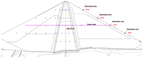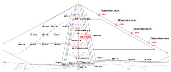 In order to effectively monitor the seepage of core-wall rockfill dams, osmometers are embedded in the dam body for monitoring. The osmometers are mainly arranged on the four monitoring sections A, C, D, and E, with 24 of the osmometers in the A section, 53 in the C section, 24 in the D section, and 7 in the E section [21]. The osmotic pressure gauge layout of the C section is shown in Figure 2.