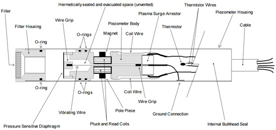The osmometer is buried inside the dam body, and the sensor cable is pulled to the observation room outside the nearby dam body. The schematic diagram of burial of typical osmometer (DB-C-P-35) and cable traction is shown in Figure 4.