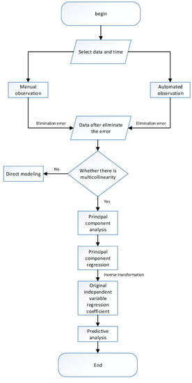 The data of the construction period was selected and the error value was manually subtracted and substituted into Equation (6). The variance inflation factor VIF = 11.225 > 10 was solved and the multicollinearity between factors was found. As shown the flow chart of research work in Figure 5, the first step is analyzing the principal components. Using the function prcomp in the R language to calculate cumulative contribution rate of the first three principal components was 98.85%. So the three principal components were extracted and established to principal component regression, which were