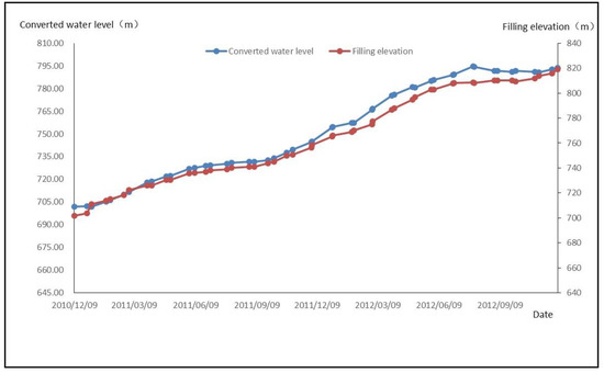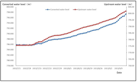 From Equation (10), it can be seen that the first principal components and , have a positive correlation. At the same time, it can be seen from the process line that the water level converted by osmotic pressure rises with the increase of time and the elevation of upstream reservoir water level.