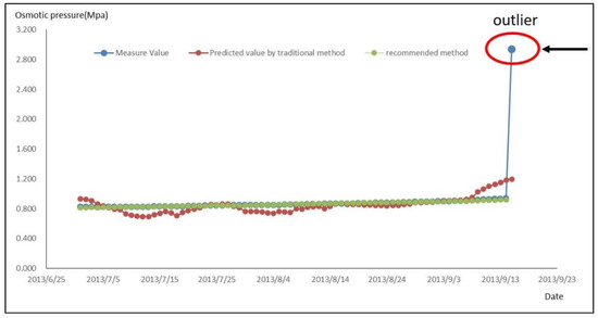 In the traditional research method, the data of the dependent variable during the water-storage period was substituted into Equation (12) to calculate the predicted value of the osmotic pressure. The time series of the predicted values in traditional and recommended method and measured values was then plotted, as shown in Figure 8.