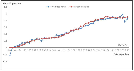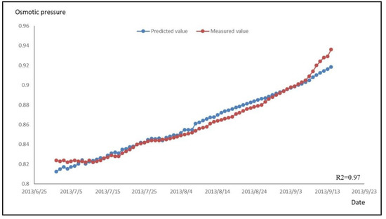 Similarly, the data of the dependent variable during the water-storage period was substituted into Equation (11) to calculate the predicted value of the osmotic pressure, and the time series of the predicted and measured values was then plotted, as shown in Figure 10.