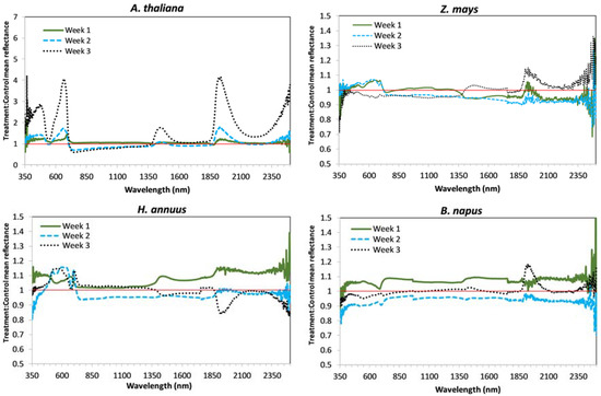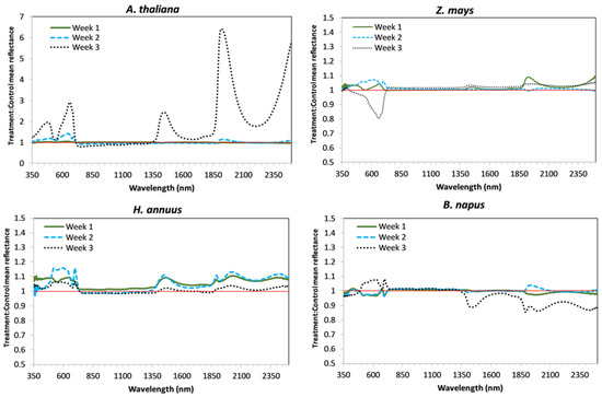 Average relative reflectance spectra of treatment compared to control are shown by week and technique (CP or FOV) for each species in Figure 1 (CP) and Figure 2 (FOV). Average reflectance spectra for each experimental group (i.e., control and treatment) are shown in Appendix A (Figure A1, Figure A2, Figure A3 and Figure A4). Average reflectance data (from which the figures were developed) is included in the supplemental online material. Notice that the vertical axes in Figure 1 and Figure 2 are consistent between Z. mays, H. annuus, and B. napus, but needed an extended range for A. thaliana.