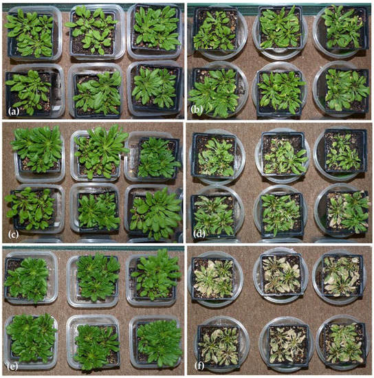 Weeks 1, 2, and 3 of the first A. thaliana experiment; response was similar in the second experiment. (a) Week 1 control plants; (b) Week 1 treatment plants which exhibit slight chlorosis along the edges of older leaves; (c) Week 2 control plants; (d) Week 2 treatment plants which exhibit chlorosis, necrosis, and decreased biomass; (e) Week 3 control plants; (f) Week 3 plants which exhibit significant necrosis.