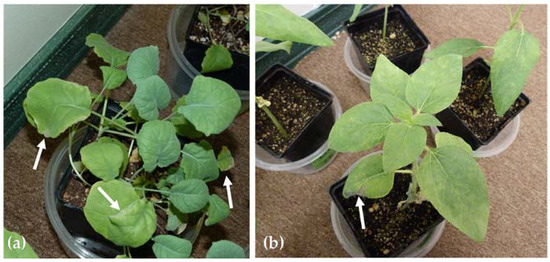 Example (a) B. napus and (b) H. annuus plants at week 3. Arrows in (a) are pointing out areas of chlorosis around leaf edges. The arrow in (b) is pointing out a necrotic spot.