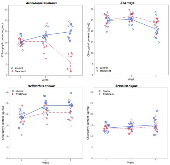 Chlorophyll content (Chl a + b, µg/mL) by week and treatment level for each species considered. Lines (solid = control, dashed = treatment) indicate mean values at each week.