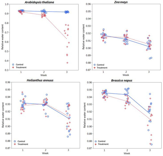 Metals can disrupt the plant-water balance [3], which can be seen as an increase in reflectance in the mid-infrared region, as water absorbs fairly strongly at 1450 nm, 1940 nm, and 2500 nm, with slight increase in the near infrared region, associated with slight water absorption [75,76]. A. thaliana was the only species that exhibited significant treatment effects associated with RWC (Table 1), although all species exhibited significant temporal differences, with RWC decreasing in time (Figure 6). The difference in treatment versus control reflectance for A. thaliana is clear in Figure 1 and Figure 2 as spikes in relative reflectance at the aforementioned water absorption wavelengths that get larger each week. Although difficult to see in the relative spectra, temporal differences in the remaining species can be seen in the average (i.e., raw) reflectance spectra as an increase in reflectance at these same wavelengths in both treatment and control plants (Figure A2, Figure A3 and Figure A4). Differences for each species except corn are greater between weeks 2 and 3 than between weeks 1 and 2, although the overall range of RWC is narrow for control plants, varying by only a few percent. It is interesting to note that the 1940 nm band in Figure 2 appears to give a qualitatively more consistent relative response between weeks than the other water bands. Although not statistically significant, B. napus RWC of treatment plants appears to decrease in time more than the control plants. This species, along with H. annuus had increasing variability (i.e., standard deviation) in RWC with time (Table A1), which explains why the apparent difference is not statistically significant.