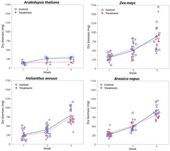 Dry biomass (mg) by week and treatment level for each species considered. Lines (solid = control, dashed = treatment) indicate mean values at each week.