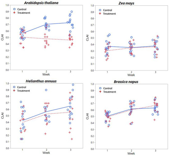 CLAI by week and treatment level for each species considered. Lines (solid = control, dashed = treatment) indicate mean values at each week.