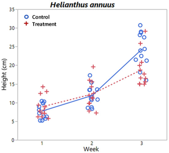 Height by week and treatment level for H. annuus. Lines (solid = control, dashed = treatment) indicate mean values at each week.