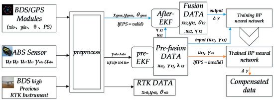 The scheme of this paper is to train the BPNN algorithm by using the heading angle speed error γ calculated from Equation (19) as the output target data (note: γ sourced from GNSS information is not an ideal datapoint, there is certain noise, but it is relatively small compared to the ABS acquisition of information noise). In order to prevent BPNN from fitting the linearity, cross validation is used to solve the problem of overfitting. The BPNN training time is relatively long, but with the help of the high computing speed of the cloud platform, the real-time performance is improved.