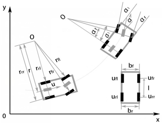 The establishment of the Pre-EKF equations is by vehicle kinematics analysis. While a vehicle is turning to prevent any additional resistance between vehicle and road and excessive tire wear, the design of the complete vehicle steering mechanism requires conformance to the Ackerman Principle [32]. As for a vehicle turning at a certain speed (Figure 3), all wheels are assumed to perform pure rolling motion, and the axes of all wheels intersect at the turning center (Point O) at this time. The complete vehicle may be virtually simplified as a two-wheel motorcycle model [33] with two degrees of freedom. In addition, the virtual steering angle corresponds to the center of the front axle. The following Equations (1)–(9) are quoted from [25], which gives a detailed introduction to the derivation process. This paper is slightly improved on this basis, where = tan () is assumed to simplify the calculation of the EKF algorithm.
