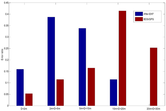With reference to the high-precision reference positioning data, a comparison is carried out to the original latitude and longitude obtained by the GNSS receiving module and the latitude and longitude data processed by means of the dual EKF model, and the distribution of their navigation error ratios is shown in Figure 7.