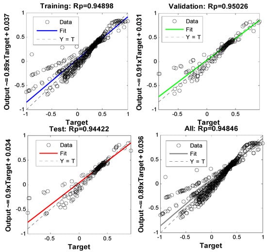 In order to prevent overfitting during BPNN training, the 30 min sample data are divided into the training, the verification and the test data. Training data are primarily to train the neural network model; and the verification and measurement data are primarily utilized to verify the training effects of the BP neural network. The regression precision analysis of the BP neural network model is included. The linear regression results of the training, verification and measurement results are shown in Figure 8 (“target” means the value normalized Δγ, “output” means and input to the well-trained BPNN output value).