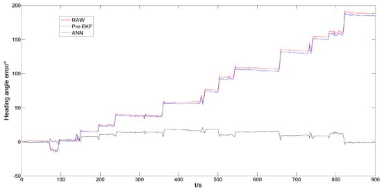 Comparison of the positioning effects of the data gained from 15 min performance display data being processed by means of the neural network model in case of GNSS information being shielded and the high-precision positioning reference data is performed separately. The heading angle speed after Pre-EKF fusion is integrated with time to obtain the heading angle and then obtain the heading angle error with reference to the high-precision positioning heading angle. The relationship between the heading angle error and the driving time is the red curve in Figure 9, which indicates that the heading angle error rises rapidly and non-linearly with time (t) and it even is up to 180° at time (15 min). The blue curve in Figure 9 represents the changing rule of the original heading angle error for the sensors. Comparison of the blue and red curves indicates that the original heading angle errors may not be corrected by combining the Pre-EKF fusion. The relationship between the heading angle errors corrected by means of the BP neural network training algorithm and the driving time is the black curve in Figure 9. The heading angle error falls from the original 180° to 15° after processing.