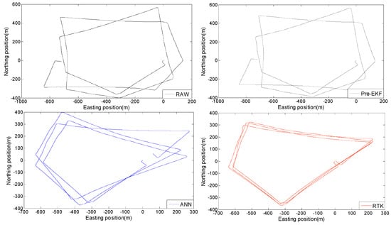 The above four kinds of data are marked as RAW, Pre-EKF, ANN and RTK, respectively. Their corresponding positioning trajectories are shown in Figure 10. Except for the trajectories of RTK, the other three trajectories are calculated by the heading algorithm. Analysis of the results shown in Figure 10 indicates that the Pre-EKF positioning trajectory is slightly corrected based on the RAW positioning trajectory but they are significantly different from the RTK positioning trajectory, but they deviate from the normal trajectory after the test vehicle began to turn and they may only be utilized for positioning the straight line trajectory in case of failure of the GNSS information, however, the ANN positioning trajectories are significantly improved with reference to the RAW and Pre-EKF positioning trajectories. Figure 10 indicates that ABS data may be corrected by the BP neural network model in case of failure of the GNSS information so that reliable positioning may be achieved within 15 min.