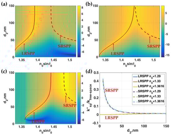 Comparison of coupling strength, ln|rp|2, of LRSPP and SRSPP in the case where n0 = n1 and d1 = 0 nm considered as pure plasmonic modes for (a) n0 = n1 = 1.29; (b) n0 = n1 = 1.33 and n0 = n1 = 1.3616. Other parameters are λ = 633 nm, n2 = 0.18344 + 3.4332i and n3 = 1.33; (d) Normalized attenuation coefficients for the cases in (a–c). The solid red curves in (a–c) were the solutions to Equation (2) for LRSPP mode and the dashed red curves are the solutions for SRSPP mode.
