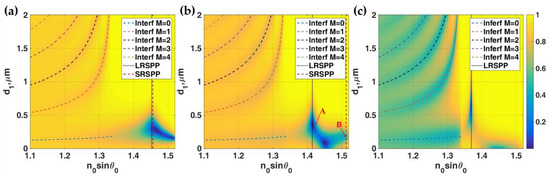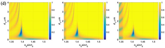 In this section, let us look at the case where . There was a range of k-vectors that the light was a propagating wave in the region I and evanescent in the region III. The range was the k-vectors with n0sinθ0 between n3 and n1. Figure 5a,b showed |rp|2 for the IIMI structure with n0 = 1.52, n1 = 1.39 (lithium fluoride: LiF [27]) with thickness d1 and n2 = 0.18344 + 3.4332i with thickness d2 and the last dielectric medium n3 = 1.34 for different gold layer thicknesses d2 = 30 nm and d2 = 20 nm, respectively. These figures were the cases when before the LRSPP k-vector matched to the range of interferometric mode k-vectors and when they matched.