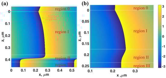 The 0th order did not have a cut-off k-vector unlike the other higher order modes [31] and it can excite the LRSPP mode. The interferometric mode positions matched very well with the Fresnel simulations. The interferometric dips were not very deep indicating that the gold layer cannot provide sufficient loss for the interferometric modes. Figure 3a–c shows |rp|2 responses of the IIMI structure with different gold thicknesses. The two plasmonic modes were excited through attenuated total internal reflection (ATR) evanescent wave, where the light was evanescent in the region I after n0sinθ0 of 1.34. The two plasmonic mode k-vectors changed when the gold thickness changed as predicted from Figure 3. The dielectric cavity height d1 played a crucial role in the plasmonic mode coupling. It cannot be too high because of the short penetration of the evanescent wave. Figure 4 showed the phase transition through the gold layer of the two plasmonic modes labelled ‘A’ and ‘B’ in Figure 3b. The LRSPP had an anti-phase pattern at the two interfaces of the gold layer as shown in Figure 4a whereas the SRSPP had an in-phase phase pattern at the gold interfaces.