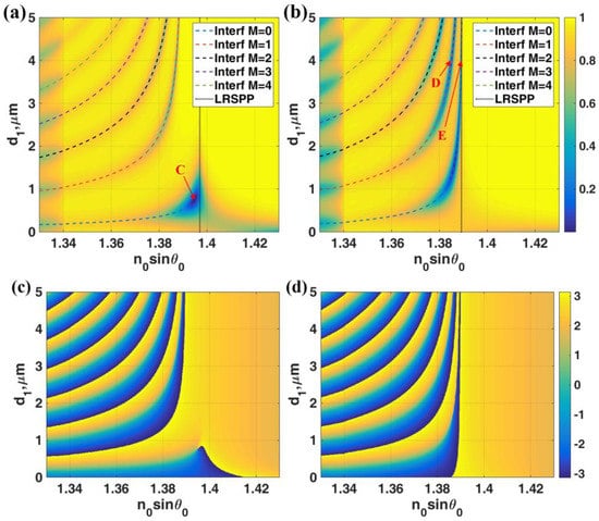 Simulation results for = 633 nm, n0 = 1.52, n1 = 1.39 with thickness d1 and n2 = 0.18344 + 3.4332i with thickness d2 and n3 = 1.34. (a) |rp|2 when d2 = 30 nm and (b) |rp|2 when d2 = 20 nm (c) Phase(rp) in rad when d2 = 30 nm and (d) Phase(rp) in rad when d2 = 20 nm. The colored curves shown in (a,b) are the interferometric mode positions calculated using Equation (3) and the LRSPP mode