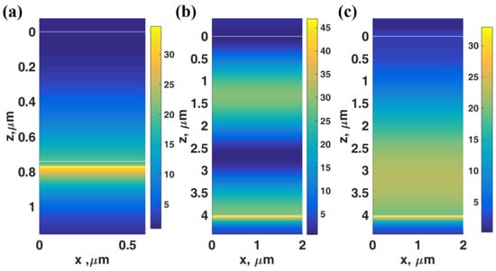 Figure 6a shows the |Hy|2 field distributions of the LRSPP excited by the evanescent wave coupling labelled ‘C’ in Figure 5a. There was no standing wave inside the resonant cavity only the re-radiated leaky LRSPP wave leaked their power back through the cavity. Figure 6b,c shows the |Hy|2 field distributions of the LRSPP excited by the 1st order (M = 1) and the 0th order (M = 0) interferometric modes labelled ‘D’ and ‘E’ in Figure 5b. There was the 1st order TM1 guided mode pattern inside the resonant cavity in Figure 6b and the fundamental 0th order mode TM0 guided mode pattern in Figure 6c. The sharpness LRSPP dips excited by the resonant cavity depended on the cavity thickness d1. Figure 5c,d shows the phase profiles of Figure 5a,b. The gradient of phase transitions for the interferometric modes depended strongly on the thickness of the resonant cavity. For the cavity thickness less than 1 μm, the phase gradients of all the interferometric modes were shallower than the LRSPP as shown in Figure 5a and became much sharper when the thickness increased. This feature allowed us to excite the LRSPP with the different sharpness of the reflectance dip, in other words, it allowed us to vary the FWHM of the LRSPP mode. We will illustrate that not only the FWHM can be adjusted by the cavity thickness, but it also gives different dip refractometric sensitivity. These will be fully quantified in the next section.