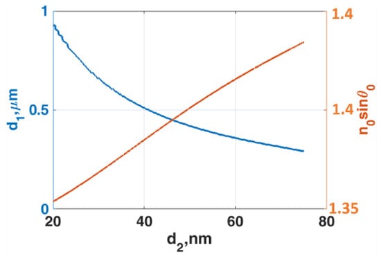 The optimal operating parameters for LRSPP excitation by evanescent wave coupling when n0 = 1.52, n1 = 1.34, n2 = 0.18344 + 3.4332i and n3 = 1.34 for different thicknesses of gold d2 ranging from 20 to 75 nm. The blue curve shows the cavity thickness d1 where the lowest intensity dip occurs. The red curve showed the n0sinθ0 positions where the LRSPP excited.