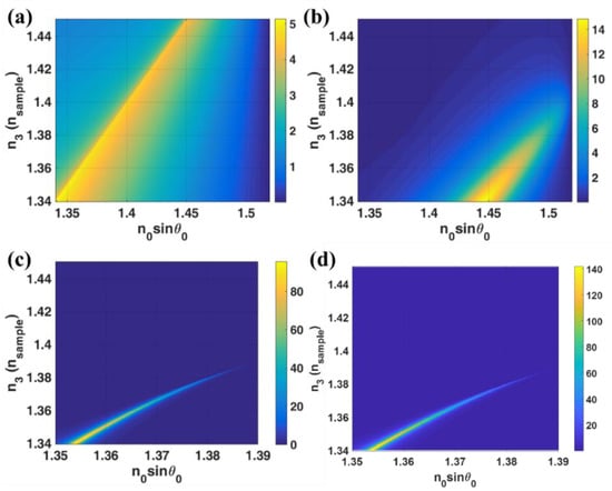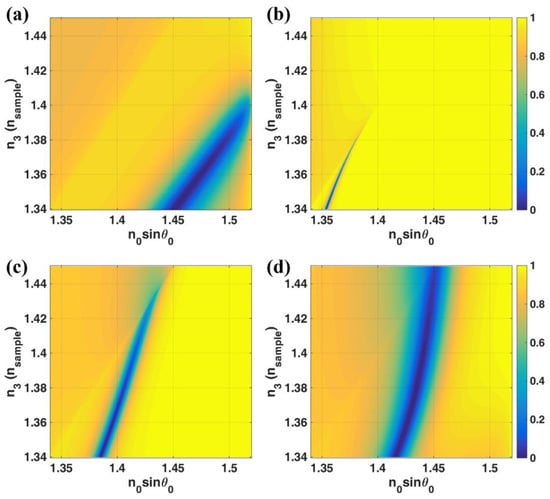 One key feature of surface plasmon resonance is the field enhancement on the surface of the metal. This unique feature is very useful for several applications including fluorescent excitation [42] and non-linear optics [43]. The field enhancement here was calculated as |tp|2 or the amount of transmitted light intensity on the metal layer. In this section, several layered structures were simulated and compared. The sample channel was again placed in the last dielectric layer with refractive indices ranging from 1.34 to 1.45, which cover a typical range for biological samples refractive indices [38,39]. Figure 10 shows |tp|2 for the different layered structure. A typical configuration for evanescent wave excitation in total internal reflection microscopy [44,45] was an interface between glass substrate and sample. The field enhancement |tp|2 for glass/sample interface calculated as shown in Figure 10a had the maximum value of 5.22. Figure 10b showed the conventional SPR excited using Kretschmann configuration. The maximum |tp|2 was 14.89, which was 2.8 times higher than the glass/sample interface. There were also a number of inconvenient issues for microscopy imaging. Firstly, |tp|2 values for each sample refractive index were not constant, forming a non-uniform field and secondly the SPR cannot cover the sample required refractive index range. Several recently developed microscopy techniques have included spatial light modulator devices such as an amplitude spatial light modulator [46], a phase spatial light modulator [47,48,49] or a digital micromirror device (DMD) [50]. Thirdly, they were excited at different k-vector positions making illumination control and difficulty in modulation. The same issues were also applied to the LRSPP excited by the evanescent wave as shown in Figure 10c,d. The 20 nm gold has been chosen since it can provide a decent amount of plasmons and a high-quality film can be fabricated. The maximum |tp|2 in Figure 10c was 6.45 times higher than the Kretschmann case shown in Figure 10a. The differences between the cases shown in Figure 10c,d was that the coupling index n0 where the Figure 10c case was 1.52 and the Figure 10d was 1.7. The n0 of 1.7 case had 1.48 times higher |tp|2 than the n0 of 1.52 case. This is because of the higher index contrast between n0 and n1 providing the higher evanescent wave enhancement. Note that the highest NA available in the market at the moment is the NA 1.7 APON100 × HOTIRF [51].