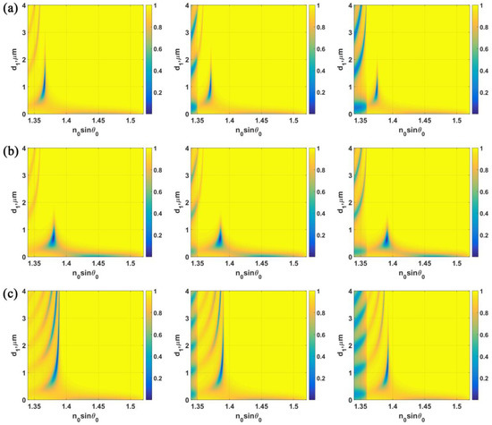 |rp|2 responses for the following structure parameters. (a) n0 = 1.52, n1 = 1.3616, n2 = 0.18344 + 3.4332i with d2 = 20 nm; (b) n0 = 1.52, n1 = 1.3616, n2 = 0.18344 + 3.4332i with d2 = 30 nm; (c) n0 = 1.52, n1 = 1.39, n2 = 0.18344 + 3.4332i with d2 = 20 nm; (d) n0 = 1.52, n1 = 1.39, n2 = 0.18344 + 3.4332i with d2 = 30 nm. Each column represents responses due to different sample refractive indices, n3 = 1.34, 1.35 and 1.36 shown in left, middle and right columns, respectively.