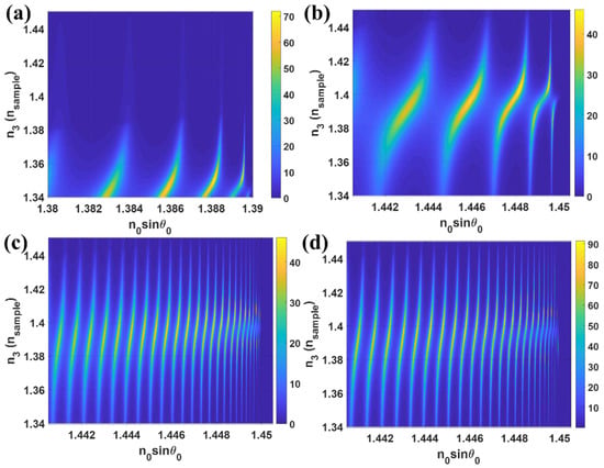 Having explained in the earlier section, the properties of the LRSPP excited by the interferometer modes can be engineered through the resonant cavity parameters d1 and n1. The sample refractive index dynamic range of the field enhancement can be controlled by the cavity refractive index n1 as shown in Figure 11a,b. Both of the structures in Figure 11a,b had the same cavity thickness d1 of 1000 nm, the difference between the two structures was that the n1 refractive indices for Figure 11a,b was 1.39 and 1.45 (silicon dioxide: SiO2 [52]), respectively. The field enhancement in n1 of 1.39 case was much greater than the n1 of 1.45 case, however, the dynamic range was much shorter. Having explained in Table 1 that the structure with the thicker cavity thickness had lower sensitivity to the refractive index change, this was also applicable to the structure design for field enhancement application. Figure 11c showed the |tp|2 responses for the cavity with n1 of 1.45 and d1 of 5000 nm. It can be seen that the k-vector position for each interferometric orders that excited the LRSPP became more linear than the thinner cavity case and independent of the sample refractive index. The magnitude of the field enhancement of 46.04 in the LRSPP excited through the interferometric mode was independent of the cavity thickness since the LRSPP was excited by the propagating wave in the cavity. Figure 11d showed the effect of the coupling refractive index n0 of 1.7. The higher coupling refractive case can enhance the field enhancement to 91.41 which was at least 5 times more than the conventional Kretschmann case.