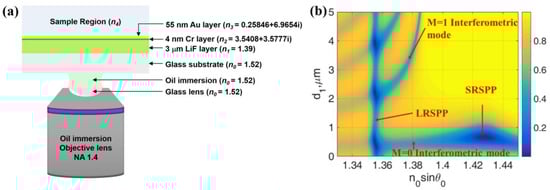 We have demonstrated in the previous section that the interferometric modes can be designed so that it does not excite the LRSPP, therefore they will not be sensitive to the sample region. On the other hand, they can also excite the LRSPP and these LRSPPs can be more sensitive than the LRSPP excited by the evanescent wave coupling as shown in Table 1. This feature enables us to design a self-referenced SPR sensor having two reflectance dips, which the dip position movement due to the variations in the sensor can be distinguished from the signal change due to the sample refractive index change. The variations in the sensor are, for example, temperature fluctuation in the sensor, evaporation of oil immersion liquid. Figure 12a showed our proposed structure, which the structure was readily integratable on an oil immersion microscope. The incident wavelength of 1.064 μm was used in this section allowing the LRSPP to be excited at a lower incident k-vector to ensure that 1.4 NA can accommodate all the two modes. The proposed structure consisted of the following layers: glass substrate (n0 = 1.52), 3 μm thick of LiF with 1.39 refractive index (n1), 4 nm thick of Cr layer with 3.5408 + 3.5777i [25] refractive index (n2) (this also served as adhesion layer between gold and glass), 55 nm of gold layer with refractive index of 0.25846 + 6.9654i [25] (n3) and the sample channel with refractive index n4 was placed on the top of the sensor. Figure 12b showed |rp|2 response when the cavity thickness d1 was varied from 0 μm to 5 μm. It can be seen from the figure that at d1 of 3 μm the LRSPP occurred at the incident k-vector lower than the 1st order interferometric mode. The two modes were well separated enough so that the interferometric mode was independent of the LRSPP as explained in the earlier section.