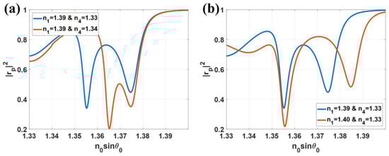 (a) |rp|2 responses when n1 = 1.39, n4 = 1.33 (blue curve) and 1.34 (red curve) and (b) |rp|2 responses when n1 = 1.39 (blue curve) and 1.40 (red curve) and n4 = 1.33.