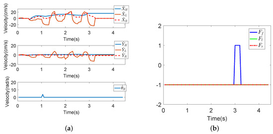 Figure 14 shows the result of Falling Mode II (fall to left) experiment. When the user is in Falling Mode II, the user leans to the left (as shown in Figure 14c). Then, the interactive horizontal force increases, and reaches the maximum value of 16. At this time, the user’s lower limbs do not move, but the robot continues to move to the left. As a result, decreases rapidly at the same time. In Figure 14b, increases to one in almost 3 s, meaning that the robot detects that the user is going to fall to the left.