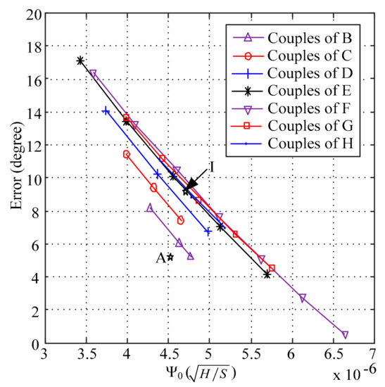 As shown in Figure 1, the value of ranges between the value of point A and the value of point I, and the points (A, B, C, D, E, F, G, H and I) on the dotted line were chosen to implement the calibration of the phase of the RFECT signal. Based on the conclusionin Section 2.1, the differences between the simulated phase and the theoretical phase of the RFEC signal are shown in Figure 3.