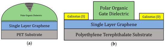 (a) Device layout showing the electric double layer being induced at the graphene-organic dielectric interface; (b) transistor architecture block diagram of the polar organic gated graphene field-effect transistors (GFETs).