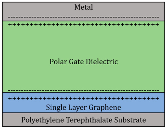 The ability of these organic compounds to exhibit dielectric characteristics is due to their intrinsic molecular polarity. Polarity in organic compounds arises from the difference in electronegativity between two covalently bonded atoms. When exposed to an electric field, the partial charges on the molecules’ resonance structures orient themselves, creating an electric double layer at the graphene-dielectric interface [9,10]. Shown in Figure 1a, the gate dielectric is probed with a gate voltage that causes the molecules to align, creating a gating effect in the transistor.