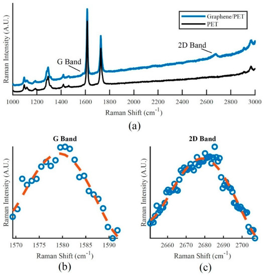 (a) Raman spectroscopy profile of monolayer graphene on Polyethylene Terephthalate (PET) and location of the Raman peaks of graphene; (b) Raman spectroscopy profile of graphene G-Band peak and (c) Raman spectroscopy profile of graphene 2D Band peak.