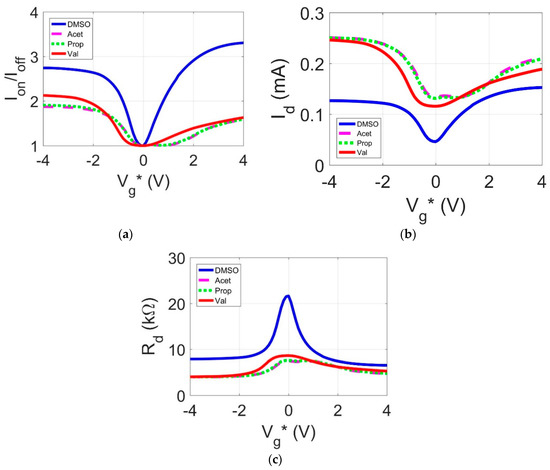 In Figure 5a–c, Vg* = Vg − VDirac where Vg is the gate voltage and VDirac is the intrinsic Dirac point. Figure 5a shows the on-off current ratio for each of the transistors. This value demonstrates the ratio of the measured current at a given gate voltage over the minimum measured current. The values of Vg* for the DMSO, acetonitrile, propionamide, and valeramide dielectrics are −0.4 V, 0.1 V, 0.1 V, and −0.6 V respectively. These values signify a shift in the charge carriers’ density brought on by the conduction of electrons through the dielectric. At Vg*, the polar organic gated transistors experience zero charge carrier density. The negative Dirac point shift corresponds with a p-type doping profile while the positive shift in the Dirac point signifies an n-type doping profile. These values match the values for the electron and hole concentrations shown in Table 2. Both DMSO and valeramide have more hole charge carriers while propionamide and acetonitrile have more electron charge carriers.