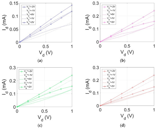 From Figure 5b, the Ids-Vg relationship for the four dielectrics is shown with Vd = 1 V. The current magnitude of Ids between −4 V < Vg* < 4 V is larger than the current magnitudes as demonstrated in other flexible graphene-based transistors [5,16] at similar top gate voltage sweeps. Although the drain current magnitude presented in [17] is on the same order of magnitude, a gate voltage sweep between −40 V and 40 V was needed to produce this current magnitude. The higher drain current values corresponding to the polar organic dielectrics are related to the relatively low gate leakage current of all four organic gate dielectrics found in Table 3. The higher current magnitude at lower voltages means less power loss when devices are in their operating modes. This characteristic has many applications in a wide range of low-powered sensors.