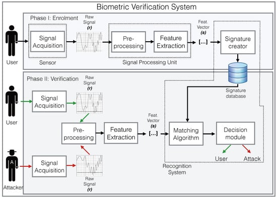 A biometric verification system is usually composed by the functional components shown in Figure 1: (i) a sensor (or set of sensors) that captures raw biometric signals (r); (ii) a signal processing unit that pre-processes and extracts feature vectors (s) from the signals (implements function ); and (iii) a recognition system, which usually includes the signature (or template) database, and implements a matching algorithm [10].