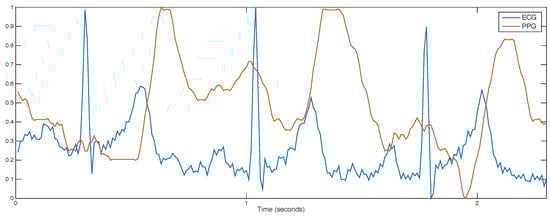 Synchronised photoplethysmogram (PPG) and electrocardiogram (ECG) signals collected from the wrist during 2–3 s. Signals were smoothed and normalised in the range 0–1.