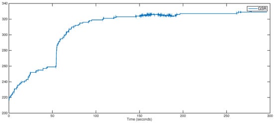 GSR signals are widely used as a distinguisher of cheating conditions [25]. It is well-known that GSR values significantly increase when the subject is under stress conditions [37]. An attacker who has managed to capture the GSR values of a victim could try to impersonate them through modification of their GSR levels by forcing them to watch violent or unpleasant videos—alternatively, the attacker could overheat the room in order to cause the victim to sweat and thus cheat the GSR sensor. As an example, Figure 4 shows the evolution of the galvanic skin response of a subject during 5 min.