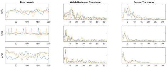 Figure 5 shows three windows of signals taken from participant number 3 and their corresponding Walsh–Hadamard and Fourier coefficients used as features. The selected transforms highlight some similarities in the frequency domain that cannot be seen in the time domain due to the lack of synchronisation of the time windows.