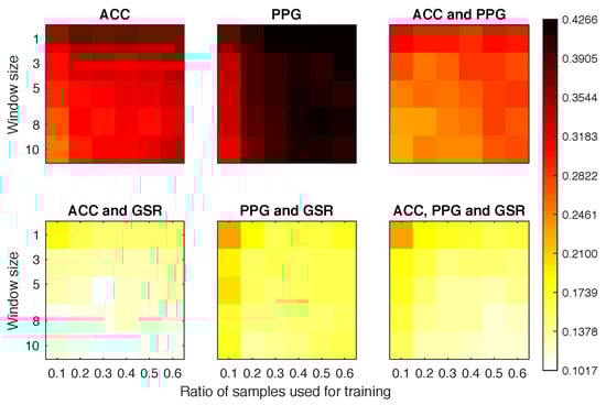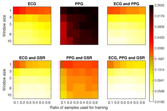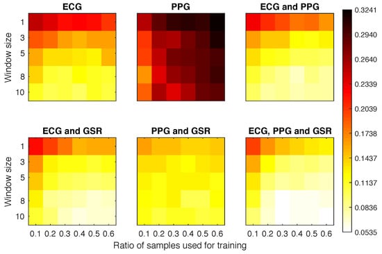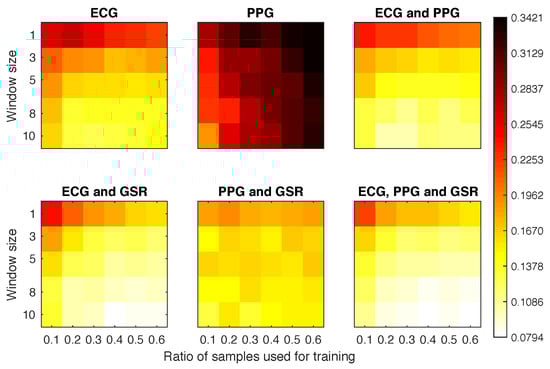 Again, the PPG offered the worst overall results (Figure 8). However, even with the classifier being tested against samples from a different activity, we still reached EER ≤0.13 for most of the configurations where the PPG was not involved and the window size was above 5. The best overall classifier was obtained with ECG and GSR, obtaining EER = 0.079 with only 40% of the sample data and 10 windows for classification.